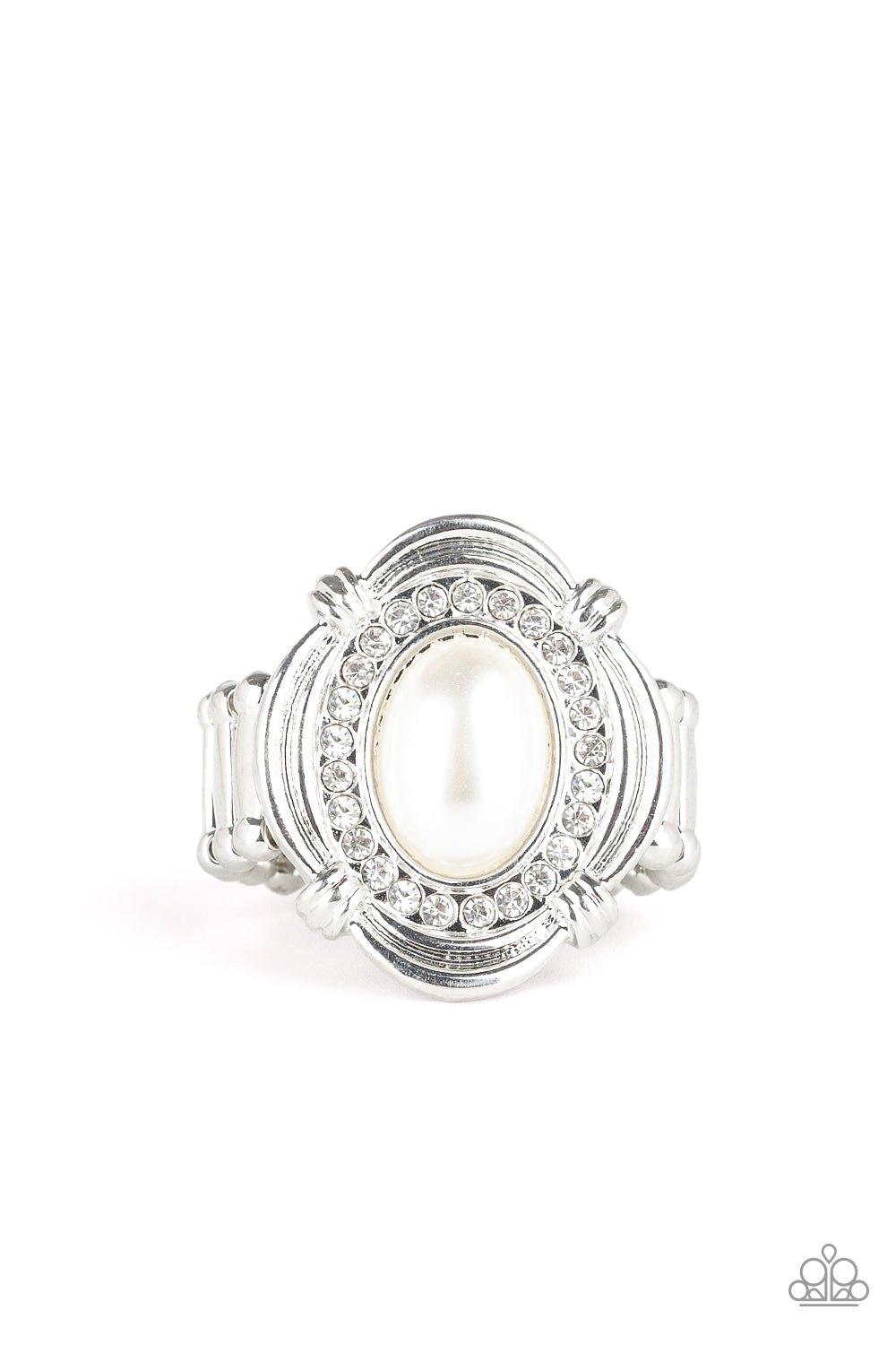 A pearly white bead is pressed into an ornate silver frame radiating with a ring of glassy white rhinestones, creating a timeless centerpiece atop the finger. Features a stretchy band for a flexible fit.